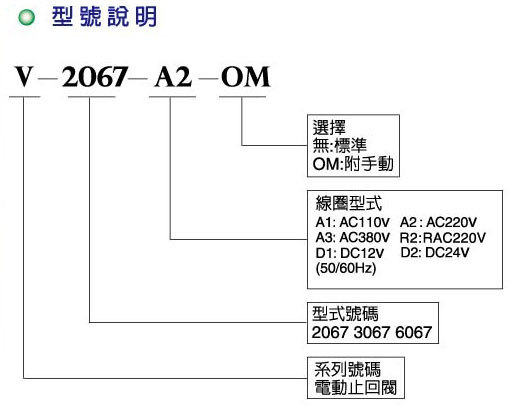形式号码 | 常开 | 常闭 | 流量 I/min | 压力 kgf/CM² | 温度范围 | 重量 (kg) | 联线方式 |