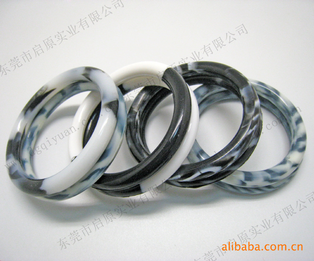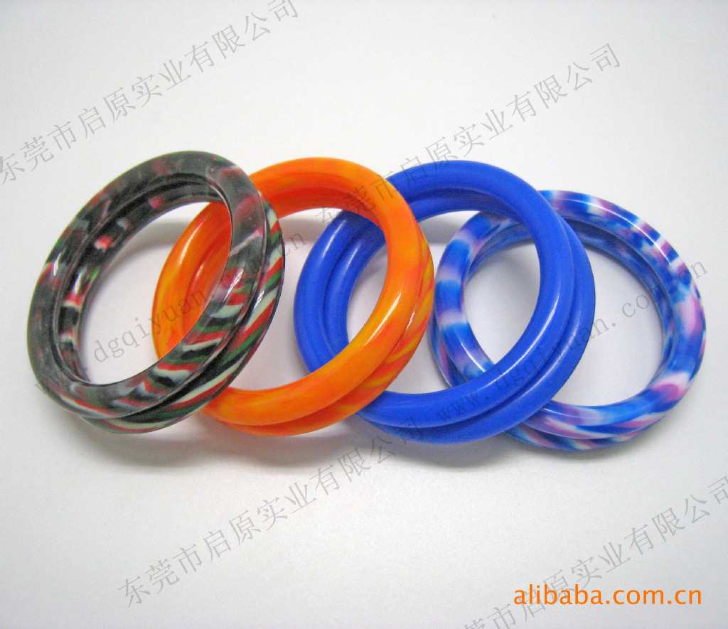 包括迷彩、段色硅胶手环。迷彩手环是用很多色胶在炼胶的时候混在一起, 然后加上模具中硫化加工,硅胶手环成型后色彩多样, 比较受到青年朋友的追捧; 段色手环即把不同色的胶料在一起同时成型,每个色段之间成型出分段手环,让本身的手环更加吸引眼球。