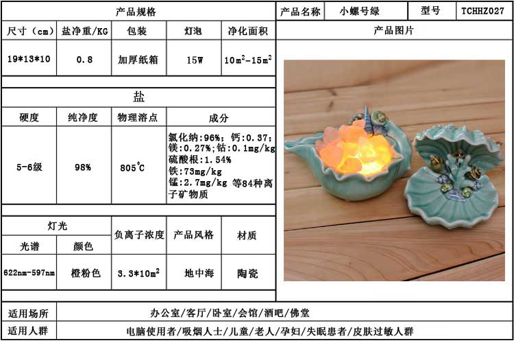 释放负离子,有效改善空气质量。所释放的负离子能够有效净化空气,明显缓解哮喘及鼻敏感等病症的症状。特有的天然撑粉色可以舒缓压力,营造舒适的空间环境。水晶盐灯通过半透明晶体结构所产生的益生光谱被公认为在颜色疗法中有极大作用的产品
