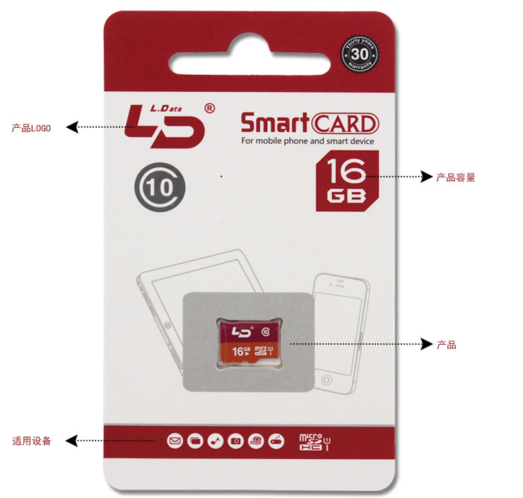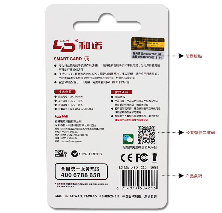 产品名称:LD TF/Micro SD(16G) 品牌: LD和诺 内存卡型号: TF/Micro SD(16G) 闪存卡类型: TF/MICRO SD卡 容量:16G