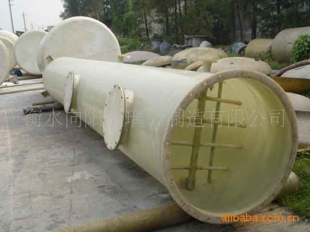 *玻璃钢塔体质量可信,性能良好*根据净化塔各部件的工作环境,分别选用了耐碱性能好和结构强度高的树脂,外表采用防水、防老化性能好的胶衣树脂。为增加塔体强度,塔体外壳采用了若干纵向加强筋,并根据各种型号的体型大小分别采用了圆筒形双筒体分段结构。因净化塔长期工作在酸碱性腐蚀气体的环境中,除承受塔体自身压力及溶液压力外,还要承受工作时的风压(风机全压在200-205mmH2O),要求全部玻璃钢制件即要有良好的耐腐蚀性能,又要保持较高的抗拉、抗压强度。因此,我厂在充分考虑和排除了强腐蚀下的强度折减系数及手糊成型工艺的离散性因素后,针对塔型结构和使用环境特点,按最恶劣的工作环境下,整个玻璃钢部件仍保持富裕的储备强度。