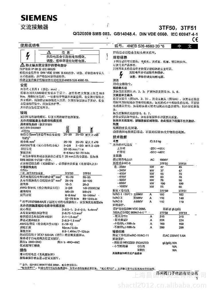 接触器用2只M6螺钉安装在平面上,螺钉的紧固力矩是10.5Nm。用螺钉安装时,一定要用平垫圈和弹簧垫圈。在安装时要防止外来颗粒,例如防止细铁屑进入里面。如果接触器暴露与灰沙、粉尘及腐蚀性环境中,应加装防护罩。