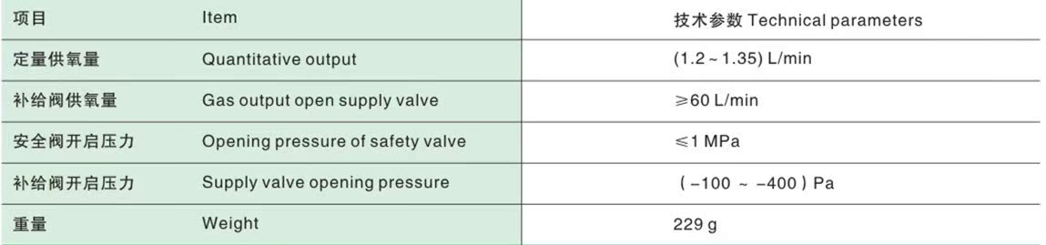 该产品采用最新气路结构,在输出气压达到设定值时,能将气体直接排入大气中泄压,高压气体不会直接进入呼吸气路中,安全可靠,保证人体呼吸不受影响。具有进气压力范围宽,输出压力稳定、输出流量恒定,体积小巧等优点,是用于ZYX30、ZYX45/ZYX60/ZYX120等型号的隔绝式压缩氧气自救器的理想配件。