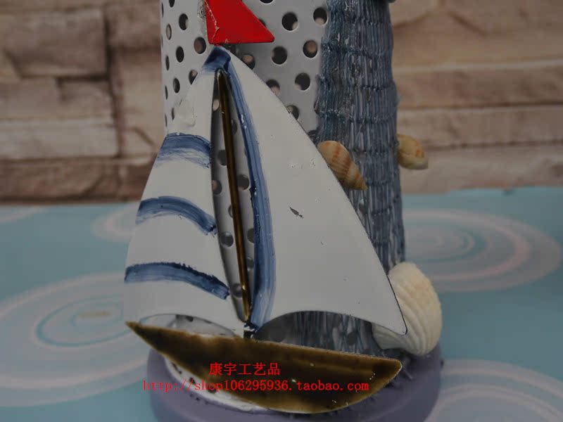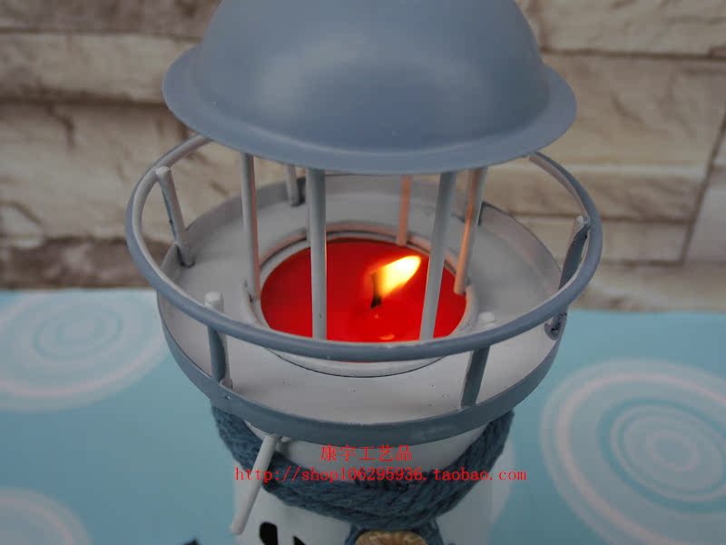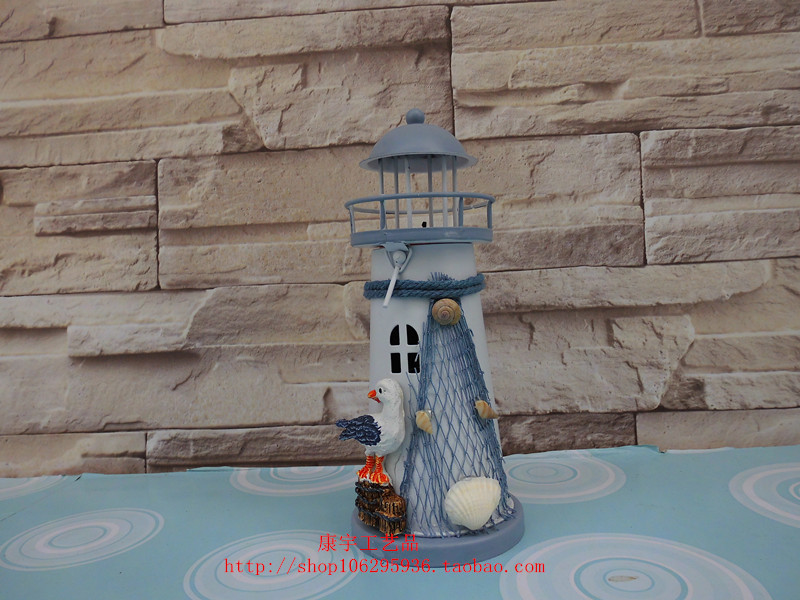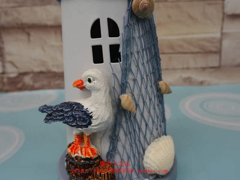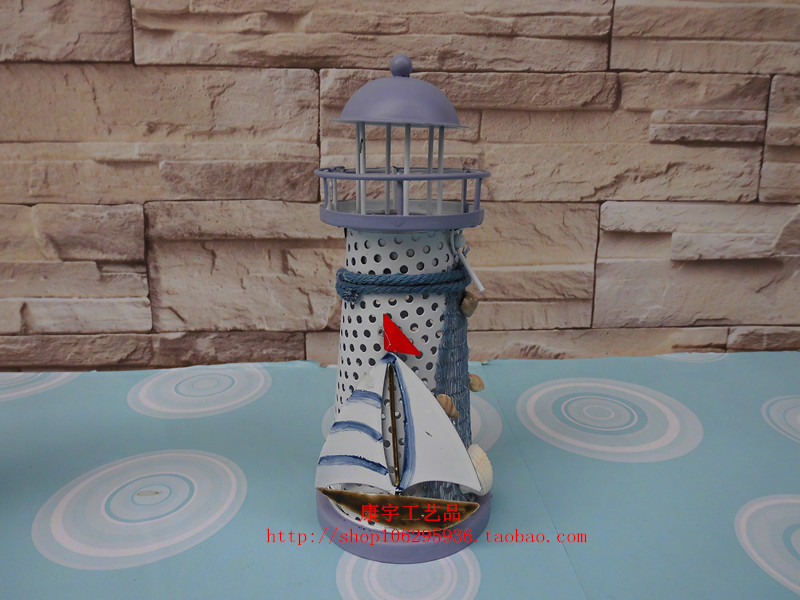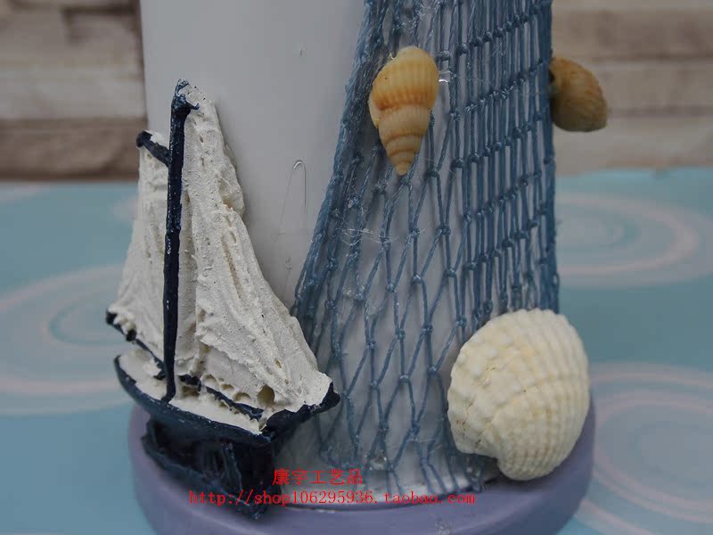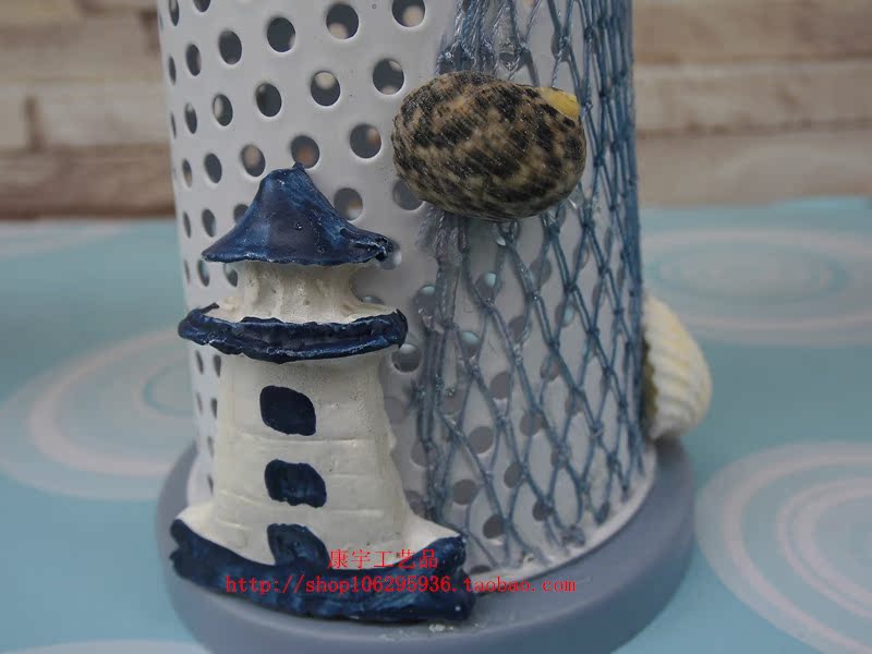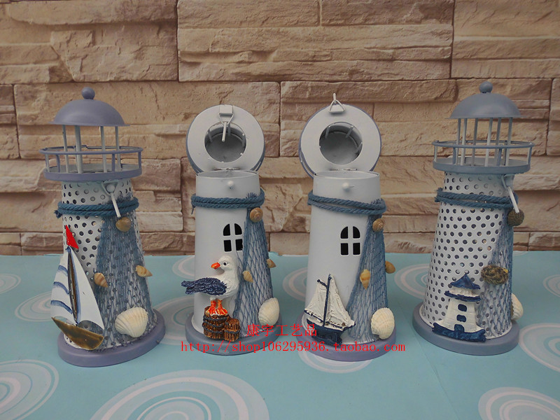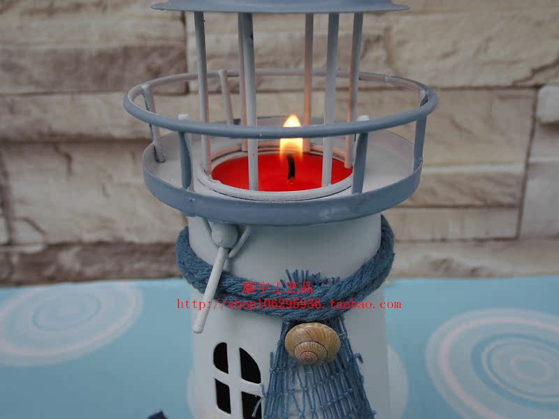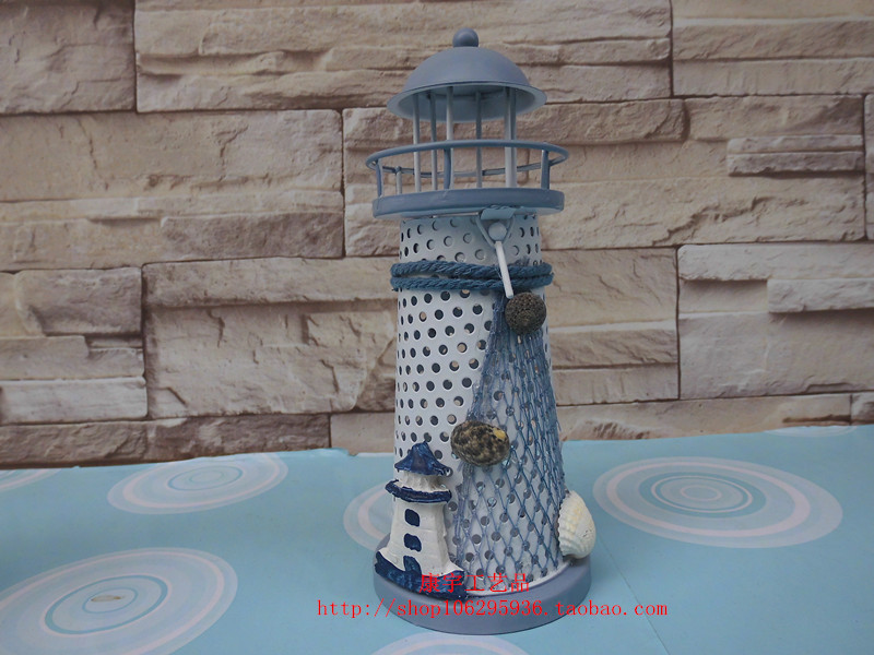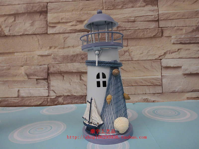 纯手工制作的铁皮灯塔,白底、淡蓝色,镂空的塔窗,布满贝壳的鱼网,这就是地中海味道。