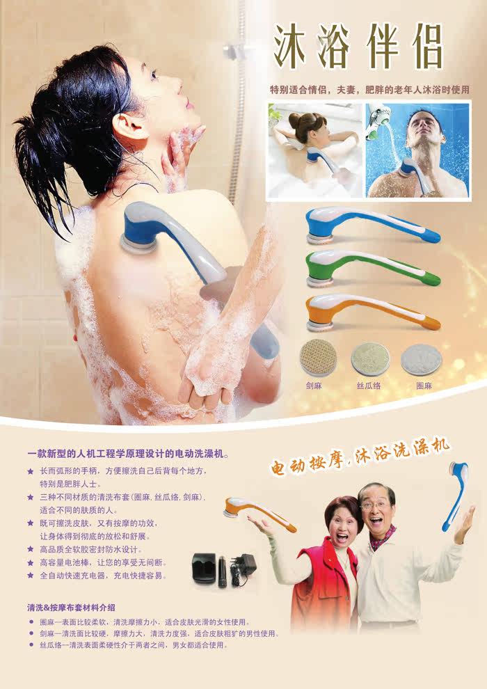 在外工作劳累一天后回到家,洗上一个舒畅热水澡,不但能为您舒缓压力、消除一天的疲劳,还可以加快您的新陈代谢增强免疫力。可是用普通的毛巾搓洗背部时总是够不着,即费力又洗不净, 特别是对一些中老年人和肥胖人士来说,洗澡时清洗背部就更力不从心了,在这为您推荐一款电动洗澡机,它可使洗澡变得轻松愉快,并在清洁的同时起到按摩的作用。