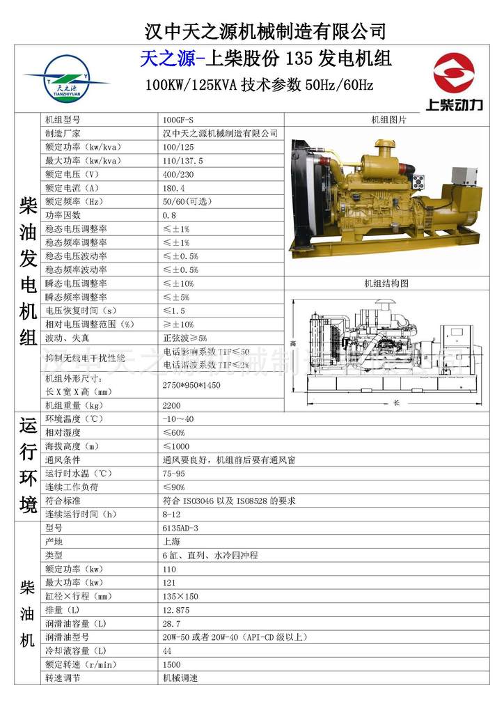 天之源柴油发电机组/上柴柴油发电机是选用中国品牌上海柴油机股份有限公司的“东风”系列135、D114、卡特(C121)等柴油机作为动力配套品牌发电机制造而成。上柴股份是我厂多年来销售最多的品牌。国产名牌组合能满足不同用户的需求,优良的动力性、经济性、稳定性、可靠性、可操作性和低廉的运行及维护成本,同时加之上股完备的全国联保的售后服务及各网点上充足的配件供应,使上柴柴油发电机组长期以来一直深受客户青睐。
