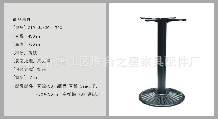 | [直径] | 430mm | | [高度] | 720mm | | [材质] | 铸铁 | | [配套配件] | 直径430mm底盘,直径76mm柱子,450*450mm十字托架,M8可调脚x4 | | [包装方式] | 纸箱 | | [型号] | CIR-JU430L-720 | | [重量] | 13kg |