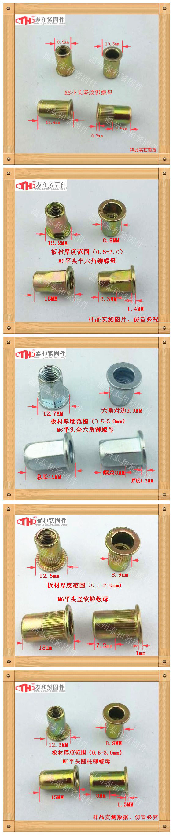 铆螺母的用途:如果某一产品的螺母需装在外面,而里面空间狭小,无法让压铆机的压头进入进行压铆且抽芽等方法无法达到强度要求的时候,这时压铆和涨铆都不可行。必须用拉铆。适用于各厚度板材、管材(0.5MM-6MM)紧固领域。使用气动或手动拉铆枪可一次铆固,方便牢固;取代传统的焊接螺母,弥补金属薄板,薄管焊接易熔,焊接螺母不顺等不足。联系人:吴康 联系电话:0577-86522867-802 手机;18681282053 QQ;1245324520传真:0577-86667180