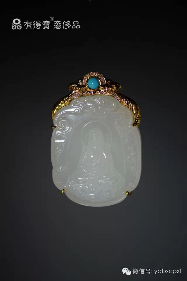 本作品选用上等白玉精雕细琢而成,释迦摩尼圆首,肉髻,细眉合眼,鼻直唇厚,衣着坦右肩大衣,大衣贴体,轮廓分明,表情祥和,双腿盘坐,玉质圆润细腻,彰显佛祖的庄重圣洁;佛手结禅定印,这是佛陀入于禅定时所结的手印,佛像四周雕刻祥云及蝙蝠,佩戴此器,纳福吉祥,庄重中传递着佛的浩然正气,慈祥中折射出佛的悲悯之心。背部镶黄金嵌钻,中心镶嵌蓝松石。