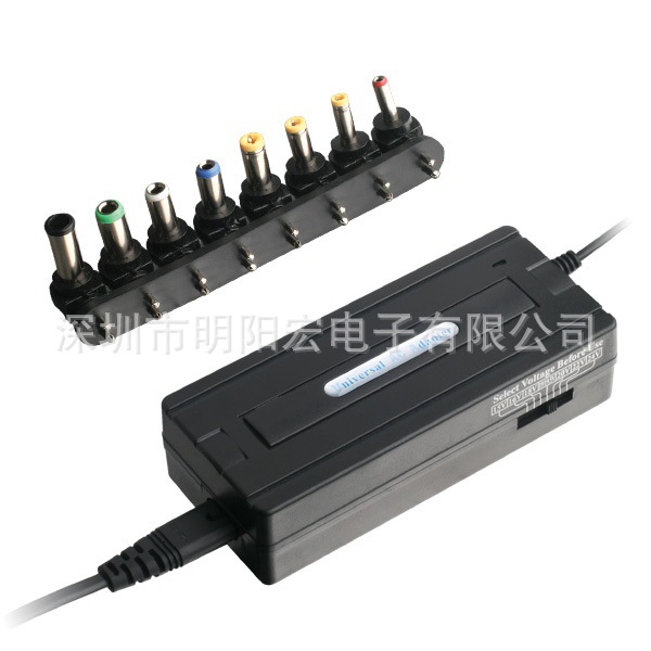 本通用型电源适配器输出功率为90W.可适用于不同厂商,不同型号的多款笔记本电脑,其中包括Samsung,Sony,Toshiba,Acer,BenQ,Lenovo,Compaq,Dell,HP,IBM和其他众多品牌。USB接口输出5v/1A电力,可作为手机、PDA、MP3、MP4等设备的充电器使用。此款充电器有7档电压调节开关,并带有8个可以简易更换的DC插头,如需用在不同品牌不同型号的笔记本上,仅需要参照笔记本输入要求调整电压和更换匹配的DC插头即可。8个DC头规格:6.0* 1.0mm 6.3 * 3.0mm 5.5 * 2.5mm 5.5 * 2.1mm 5.5 * 1.7mm 4.8 * 1.7mm 4.0 * 1.7mm 3.5 * 1.35mm.