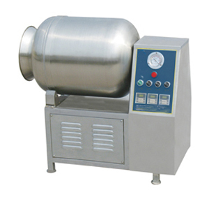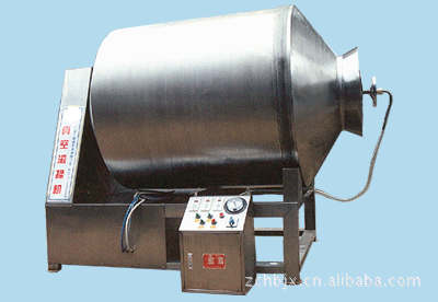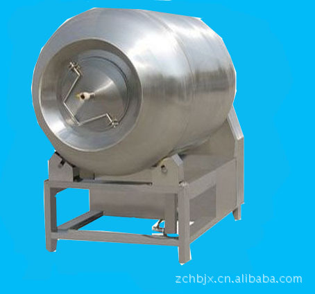 真空滚揉机是在真空状态下,利用物理冲击的原理,让肉在滚筒内上下翻动,相互撞击、摔打,达到腌渍作用,使肉均匀的吸收腌渍,提高肉的结着力及产品的弹性,通过滚揉能使肉体蛋白质分解成水溶性蛋白,易被人体吸收,同时能使添加料(淀粉等)与肉体蛋白质互为融合以达到肉质变嫩,口感好,出口率高。本机具有肺呼吸功能,让产品在滚筒内膨胀、缩小了往复运动,改善了肉组织的结构,提高了切面效果。