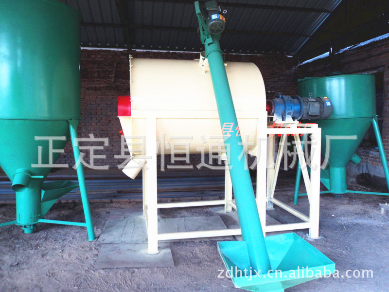 5.使用卧式混合机要注意投料的次序。一般是先投大料,如玉米粉、豆粕粉等,然后 再投小组分料,如预混料。注意预混料一定不用螺旋提升机投料,应用一次性翻斗式投料,或用人工投料,这样可以避免预混料中有效成分的离析流失。