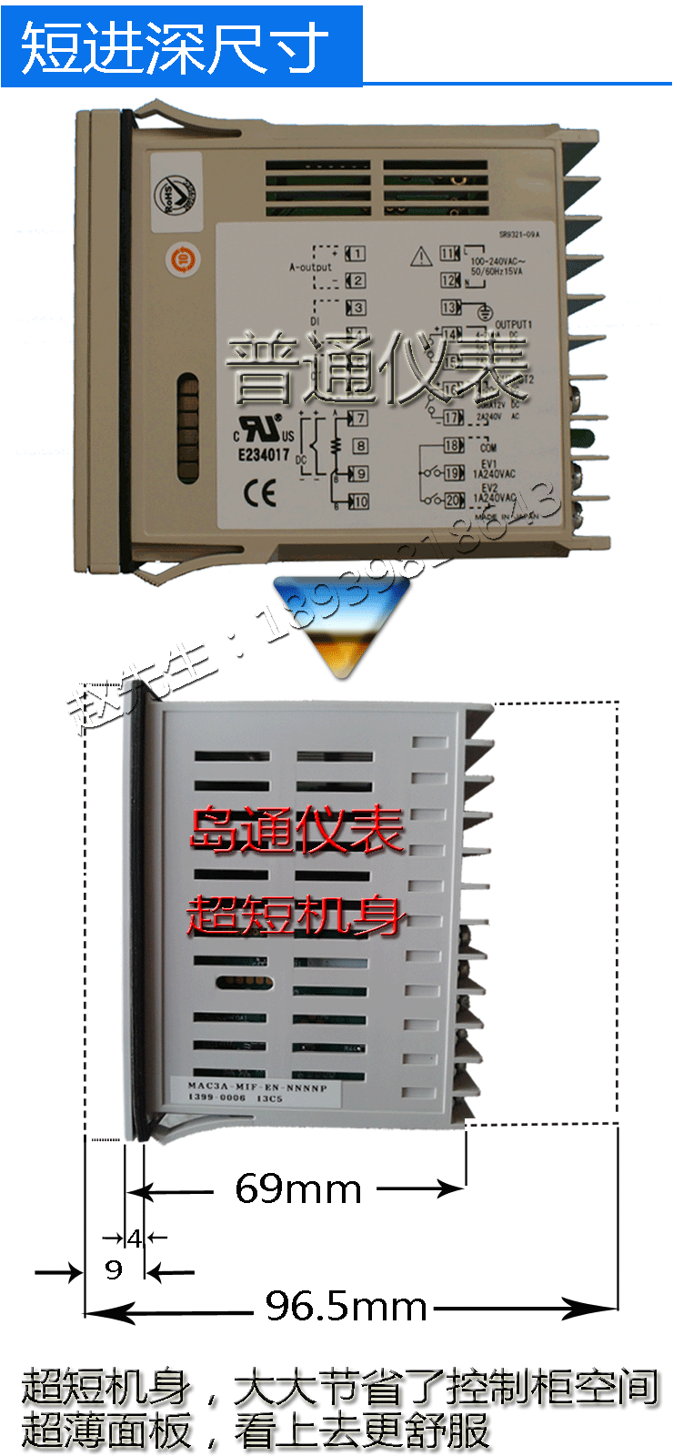 超薄机身,无超调智能专家和双自由度PID算法,三组独立PID参数,AT自整定,手/自动无扰切换控制,调节输出限幅及缓启动输出,四个SV予设值,3路事件输出,4路DI输入,40步可编程(4条曲线),模拟变送输出,数字通讯功遥控功能。采样周期:250ms。前面板防护等级IP66,RS485(MODBUS)通讯协议。报警输出常开常闭可设定,输出OUT1分辨率:1/12000
