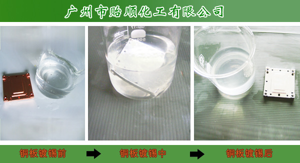 二、产品特点:产品可用于紫铜,黄铜,铍铜等铜合金表面进行化学镀锡,锡镀层为光亮银白色,可增加铜的焊接性和装饰性,不影响导电性,可用于电子工业,家具器具,食品包装等方面。防氧化,增加铜工件美观,产品无毒无重金属,盐雾测试大于45小时不生锈。不需电镀设备,只需浸泡,方便简单。