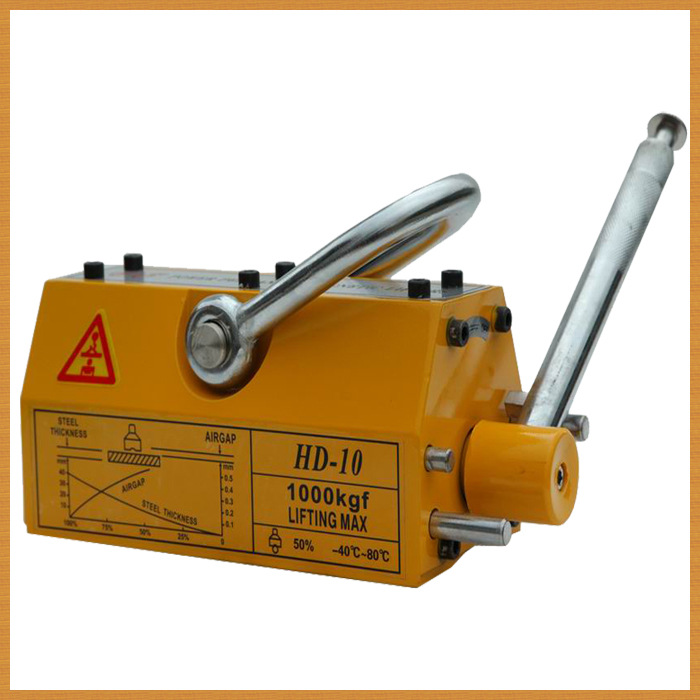 永磁吸盘(又称永磁吸吊器、永磁起重器)分为手动型永磁起重器和全自动永磁起重器两种,采用当代高性能 Nd-fe-B 磁性材料钕铁硼,使之体积更小、自重更轻、吸持力更强,独特磁路设计,剩磁几乎为零。安全系数高,最大拉脱力是额定起重力的 3.5倍。手动型永磁起重器手柄开关附有安全钮,可单手操作,无需用电方便安全。起重底面“ V ”型槽设计。全自动永磁起重器无需人力扳动手柄,靠电动吊车下钩的升降控制吸附,可起吊相对应的圆钢、钢板,不用电,使用安全,广泛用于钢材的起重搬运,平整的机械零部件及各种模具的安装和搬运。 适用于造船、工程机械、汽车等行业常温钢板起吊、搬运等作业的起重工具。 主要用于吊装过程中与被吊装工件的连接,(比如:和环链电动葫芦,钢丝绳电动葫芦等配套)用于移动铁板、块和圆柱形导磁材料的工作。操作方便、安全可靠、结果紧凑轻巧。广泛应用在工厂、码头、仓库、交通运输行业中。改进装卸搬运作业的工作条件,提高劳动效率。