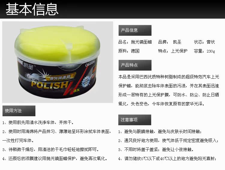 本品是采用巴西优质特种树脂制成的超级特效汽车上光保护蜡,能彻底去除车体表面的污渍,并在其表面迅速形成一层特有的上光保护膜,可防水、防尘、防止日晒氧化,失色变色,令车体恢复原有的豪华光泽。