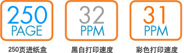 • 草稿模式下的打印速度可达32页/分钟(黑白)/ 31页/分钟(彩色)• 高品质ISO打印速度高达:7页/分钟(黑白)/(彩色)• 利用内置有线网络共享宝贵资源,支持最多5台计算机通过网络共享1台打印机• 250页进纸盒可轻松完成大印量打印任务,增值又高效