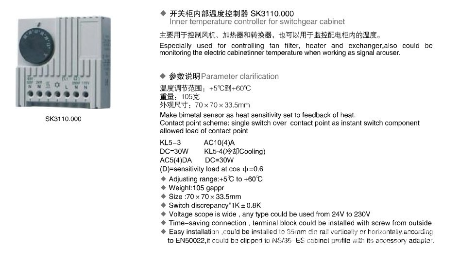 常开接点/NO(蓝色外壳)调控过滤器风扇的,热转换器,冷却设备,或转换信号设备,当温度到达设定值时,联系关闭,防止温度上升.