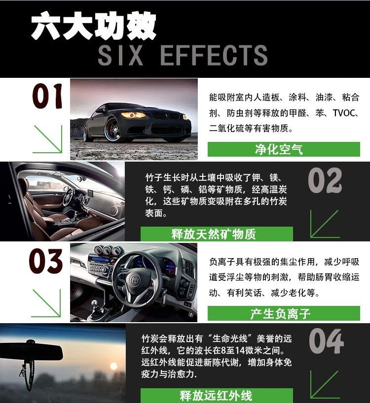 5、负离子作用:从竹炭中产生的负离子具有穿透作用,能松弛神经、消除疲劳。在室内,从竹炭中产生的负离子与空气中的颗粒物相撞,使其带电,这些带电的颗粒物容易附着在墙壁、镜面、地板上,达到净化空气的目的。置身其中,让人感受徜徉于大自然的森林中一般心神舒畅
