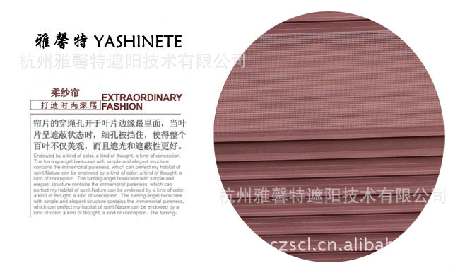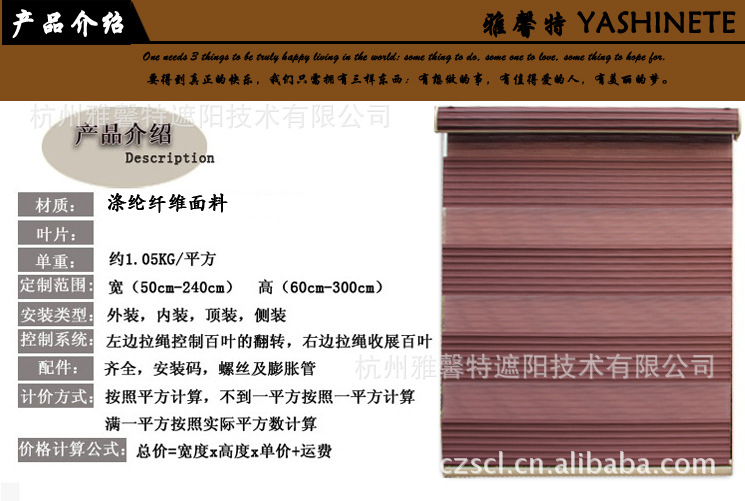 双层透光帘布设计--中间透光帘片宽2`1/2,具有百叶帘开启,调光功能。--调节帘布角度,可使不同透光度帘布重叠,拥有布艺轻柔的质感。有效阻挡紫外线--隔光帘布闭合时可隔离98%紫外线,保护室内物品免受紫外线损--隔光帘布开启时可隔热63%紫外线。帘布表面经高温,高压,防静电处理--帘布不易积灰,清洁保养简单,方便--面料不易变形。有内藏式顶槽-窗帘完全收拢时,帘布与底槽完全隐藏于顶槽内,可有效保护窗帘。双层可局布调节光线的柔纱帘,集百叶帘与卷帘功能一体,立体感强,非常温馨,适合家居,酒店,别墅高档写字楼等办公场所。