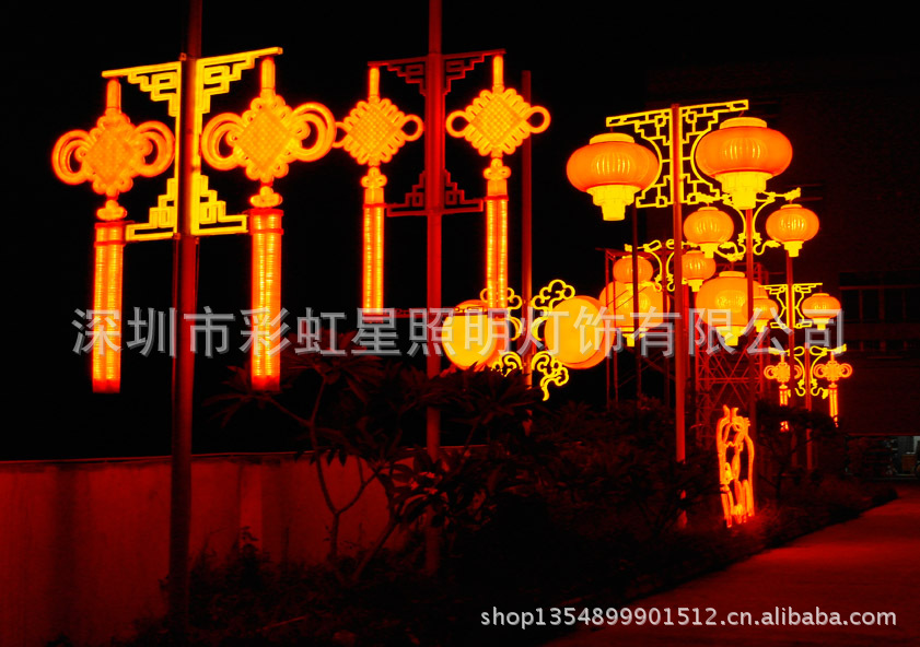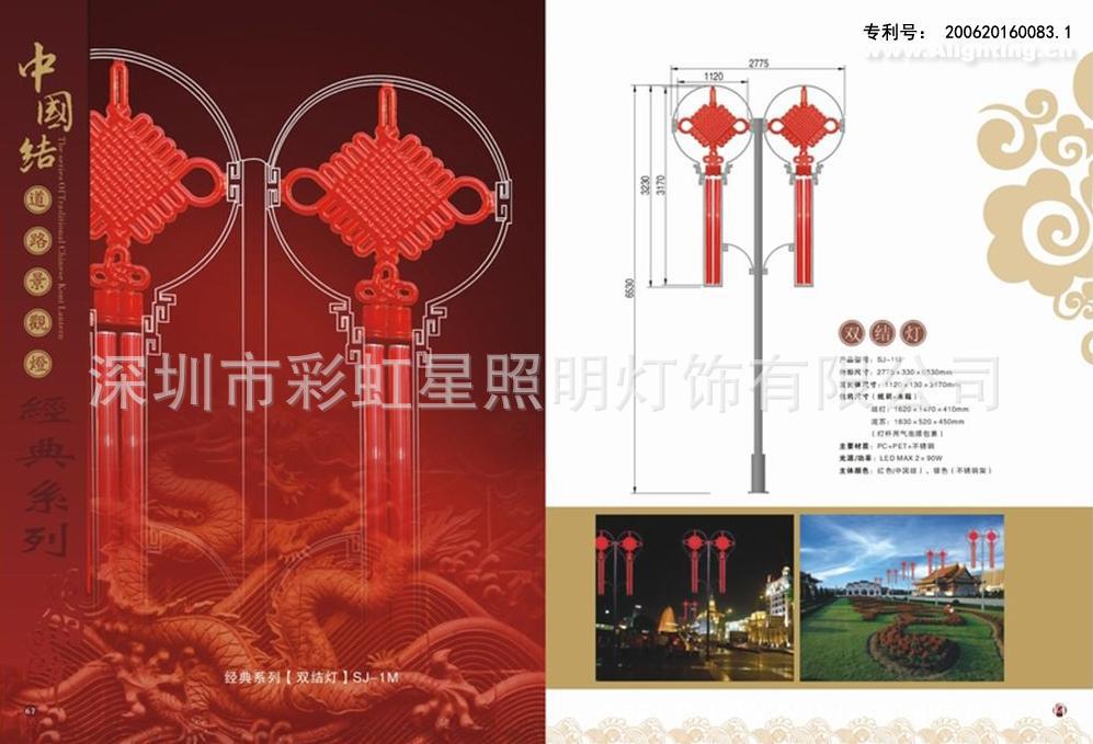 LED中国结有均匀发光(通体发光)型、点状发光型,中国结具有浓厚的中国传统文化气息,由经典中国结、垂吊榴梳管等元素组成。照明与装饰效果兼备,杆体材质多样,光源运用灵活多变。产品适用于道路照明灯杆、城市街道广场、会展会馆周边、公园小区、公司、店面等景观装饰照明。LED发光中国结灯能防水、防虫类、防尘;省电,低碳;外形美观,强度高。