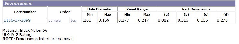 Part Number:1116-17-2099Material:Nylon 66Material Color:BlackCarton Quantity:25000 pcsMinimum Order Quantity:25000 pcsCarton Weight:11.60 lbs.Description:Mini Pro-Lok RivetUsually Ship in:4 WEEKS