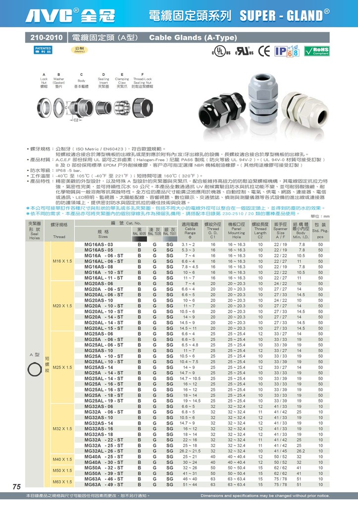 公制牙 ( ISO Metric / EN60423 ),符合歐盟規範。短螺紋適合接合於薄型機板的出線孔或是對應於附有內(攻)牙出線孔的設備,長螺紋適合接合於厚型機板的出線孔。A.C.E.F 部份採用 UL 認可之非鹵素 ( Halogen-Free ) 尼龍 PA66 製成 ( 防火等級 UL 94V-2 )。( UL 94V-0 材質可接受訂製 )B 及 D 部份採用標準 EPDM 戶外耐候橡膠,客戶亦可指定選擇 NBR 機械耐油橡膠。( 其他用途橡膠可接受訂製 )