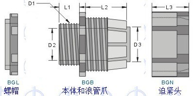 ※ 若分开订购各零件时,请在型号后面加上各代号:螺帽(L)垫片(W)本体(B)迫紧头(N)例:订购BG-16螺帽,型号为BGL-16。