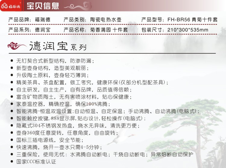 福瑞德 陶瓷电热水壶 菊香满园 烧水壶泡茶壶薄瓷套装 包邮