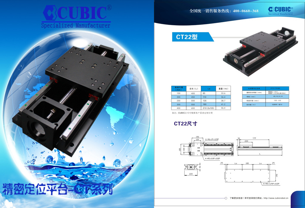 4、多轴台式系列化:多轴台式已系列化,能作为高功能多轴机械手使用。CT系列列精密定位工作台备有AC伺服电机和步电机;可根据用途自由选择。