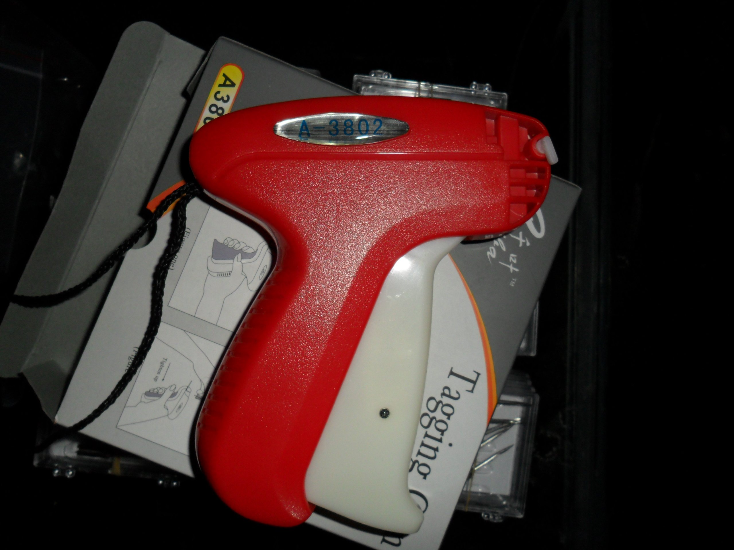 2、 贴上标签,将针穿过标签洞和织物,扣紧扳机。