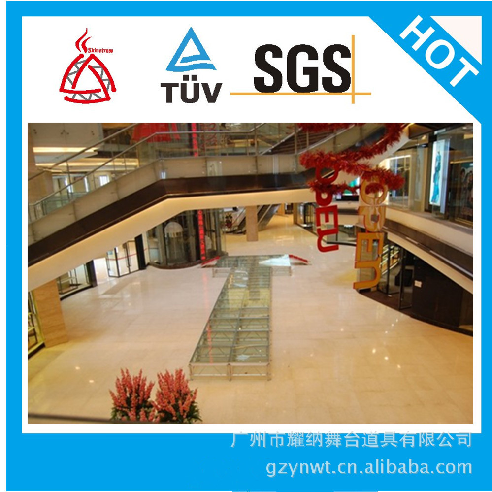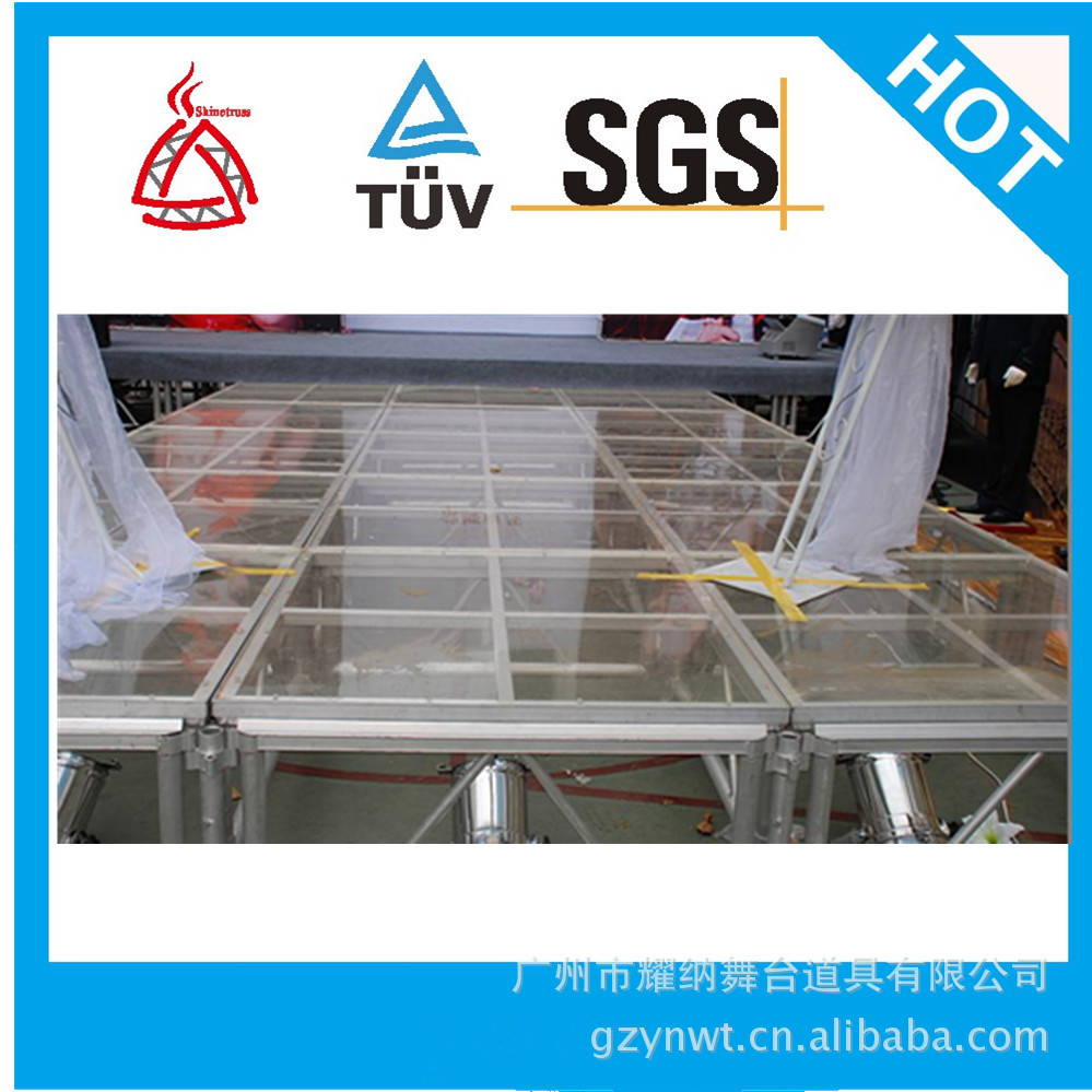 玻璃舞台说明:由支架,立柱,伸缩管,可调节底座,舞台板组合而成。每张舞台和相邻的舞台的立柱和支架是共用的,所以连接好后是一个整体非常牢固。拆装和安装方便,其舞台面是由有机玻璃或者钢化玻璃与铝框构成,其具有较好的防火阻燃、耐磨损、无伤害、装饰性强等特点,舞台框采用高硬度铝合金材料,结构牢固。库存占空间不大,容易存储。使用于演出,开会,庆典等活动。
