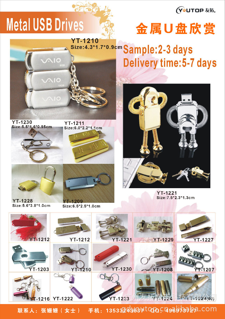 YOUTOP友拓U盘诚邀各类商家定制: 友拓数码专业生产各类U盘,产品线丰富(礼品U盘、 广告U盘、U盘笔、加密U盘、卡片U盘、金属U盘、钻石U盘、皮套U盘、木质U盘、硅胶U盘、旋转U盘,迷你U盘,手腕U盘等等),产品通过了国家技术监督局检验合格和中国质量万里行质量认证。 我司提供的产品服务有: 1,特色礼品 广告U盘:除在U盘盘体印制LOGO外,U盘芯片内可固化 企业的广告宣传片(视频、文档、图片等)自动播放增值服务,广告内容直接嵌入芯片,使用者无法删除,真正做到由内到外个性定制。用户每天都接触U盘,日益久远,记忆深刻,U盘 的使用寿命长,等于企业花了一次钱,做了几年的广告,一次投放,品牌宣传效果永久。 2,承接各类OEM/ODM,可根据客户要求定制LOGO(激光,喷绘,丝网印刷,雕刻,高频压印等工艺)个性化产品LOGO定做。作为商务礼品,展会礼品,电子礼品,会议礼品,单位办公用品,员工福利礼品,促销活动品,与其他产品绑定销售赠送等,应用范围广泛。 可选包装:礼品盒/马口铁盒/小纸盒/透明PP盒/吸塑包装/OPP袋/等,以下图片供参考。