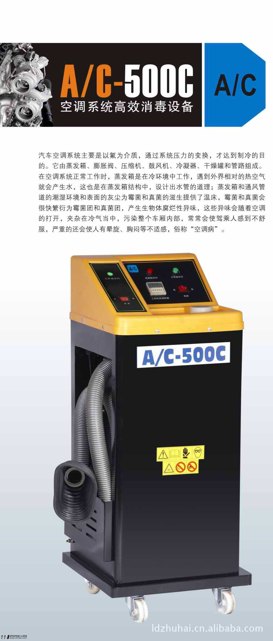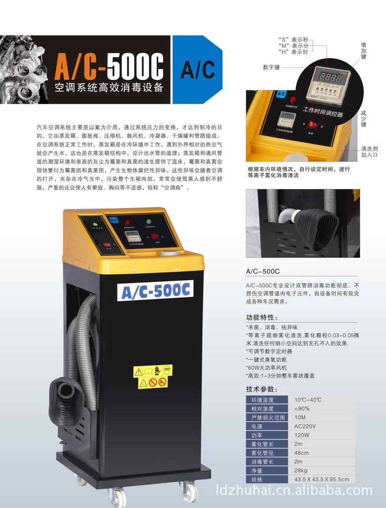 A/C-500是我公司最新的一款设备,其集空调外循环、内循环、风口、车厢消毒杀菌等功能于一身。功能全面、强大,是4S店、汽修厂不可缺少的好帮手;使用A/C-500是你最明智的选择。