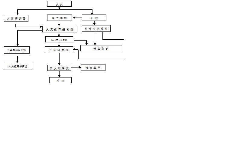 用于控制器失效时,当职守人员判断为火灾时,应立即通知现场所有人员撤离现场,在确定所有人员撤离现场后,方可按以下步骤实施应急机械启动;1手动关闭联动设备并切断电源。2打开对应保护区选择阀。3成组或逐个打开对应保护区储瓶组上的容器阀,即刻实施灭火。