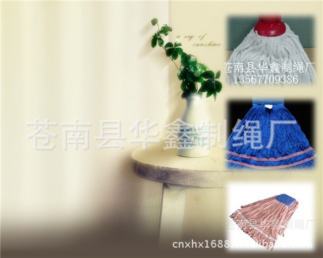 苍南县华鑫制绳厂专业从事生产制造清洁用品,如拖把、拖把头(水拖、平拖)、尘推尘掸、汽车清洁刷、超细纤维绳、 宠物绳、再生棉线、棉纱、工业清洁抹布、各种织带等,并是一家棉纱 纤维合股加捻、编织供应清洁用品领域的企业;公司具有一条龙生产线,有一支高效奋发创新优秀的年轻团队,拥有完整、科学的质量管理体系。自建厂以来,以“诚信建立合作、经验争取时间 、品牌赢得市场”的经营理念,以诚信、实力和产品质量获得业界的认可。本厂质量方针:以质量求发展,用品质铸就百年华鑫。 精细化管理——细节主义,精耕细作,将事情做到最好。 环境方针:立足法规,减少固废,着眼绿色,注重安全,持续提升。 我们的宗旨:为客户创造更高的价值!公司使命:让合作伙伴更具竞争力发展理念:诚信服务 为成功而来。货运物流:以温州成熟的物流运输体系,让每笔订单货物安全、快捷的到达每个目的地。(产品远销全球)公司原则:一直坚持不懈的去努力做过硬的产品、快捷的交货、合理的价格、完善的服务、互信、互利、平等协作的合作原则,让每一次合作使我们的客户获得利润最大化,让我们的每一位客户能最省心,省力,省时的完成每一次合作,合作让伙伴百分百满意是我们的追求。华鑫----作为拖把 制绳行业的新秀,以健康、稳定的发展取得令人瞩目的成绩,在行业一直处于领先地位,我们相信有您的加入,我们会将有更多期待!苍南县华鑫制绳厂竭诚欢迎国内外广大客商莅临参观、指导和业务洽谈。阿里旺旺:chenqixiang2008 公司网站: 官方网站:/ 移动旺铺: 欢迎来样定做。电话:13567709386陈先生 18968746818林女士 商务QQ:710733440 细节决定成败,质量决定生命;凭竞争谋生存,靠创新求发展!