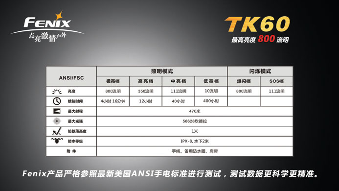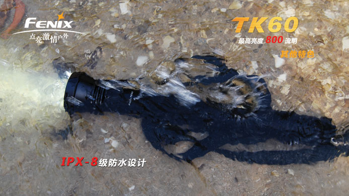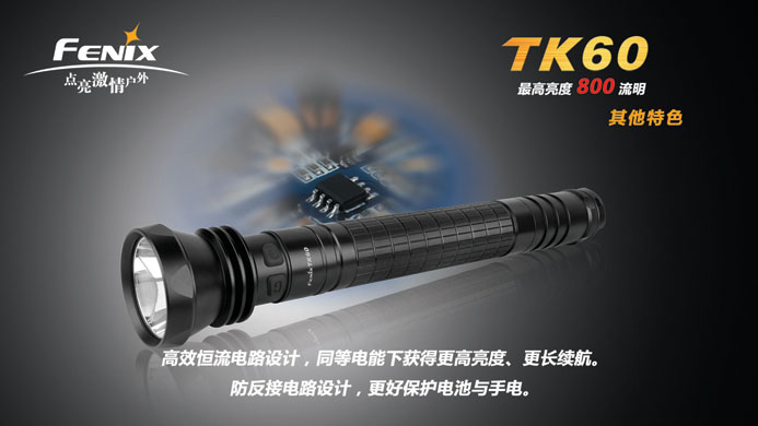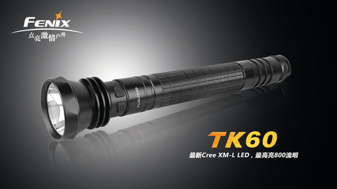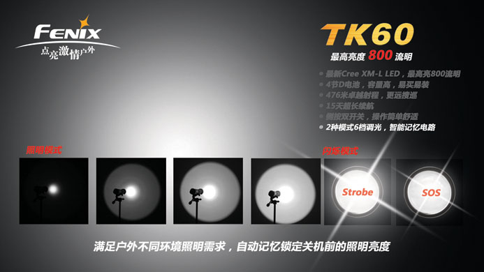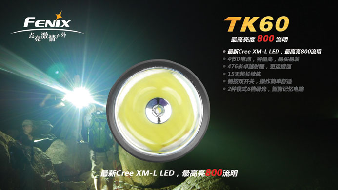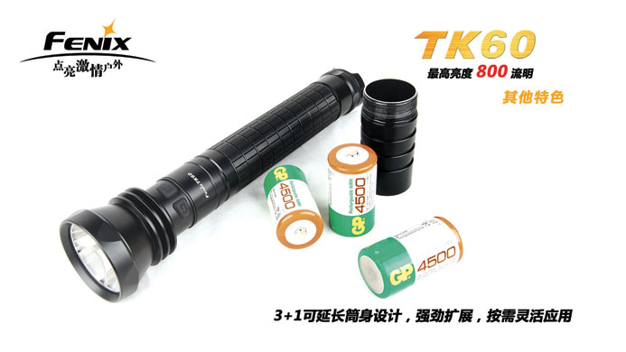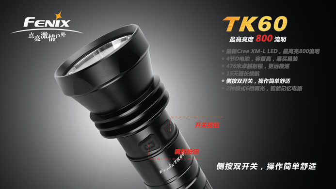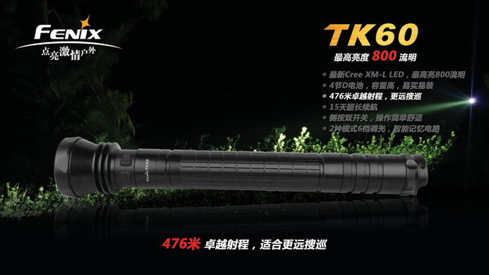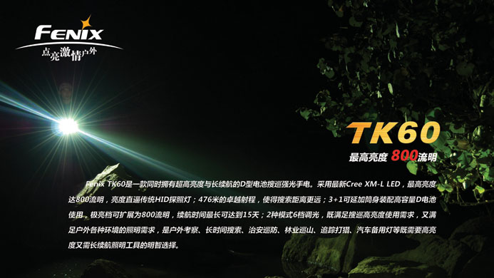 Fenix TK60是一款同时拥有超高亮度与长续航的D型电池搜巡强光手电。采用最新Cree XM-L LED,最高亮度达800流明,亮度直逼传统HID探照灯;476米的卓越射程,使得搜索距离更远;3+1可延加筒身装配高容量D电池使用,极亮档可扩展为800流明,续航时间最长可达到15天;2种模式6档调光,既满足搜巡高亮度使用需求,又满足户外各种环境的照明需求,是户外考察、长时间搜索、治安巡防、林业巡山、追踪打猎、汽车备用灯等既需要高亮度又需长续航照明工具的明智选择。