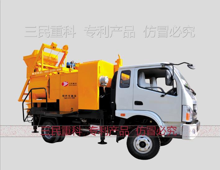 三民重科车载式混凝土搅拌拖泵(又叫搅拌车载泵),是搅拌拖泵升级产品;是汽车底盘与强制搅拌拖泵的超强组合,产品配备柴电双重驱动,拥有强大的机动性能,适合多工地之间转场,投资成本低,回报率高;是三民重科新专利产品,适合用于10层左右的民宅、商品楼、小型桥梁、农田水利、电力通讯等野外地点分散的,现场搅拌的混凝土施工的工程。具有快速灵活,移动方便,速度快,节省人工的特点;也是创业的佳之选。三民重科车载式搅拌拖泵于2013年推出以来,以良好的质量、优秀的服务迅速占领了混凝土机械80%的市场份额。
