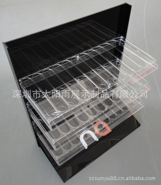 此款展示架采用的是3mm亚克力透明板粘接而成,开料后经过抛光、锣边、丝印、雕刻后再粘接而成的。