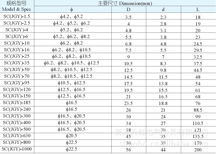 SC(JGY)引进窥口铜接线端子适用于标称截面1.5mm2~1000mm2电力电缆式电线的铜导体与电气设备的连接。