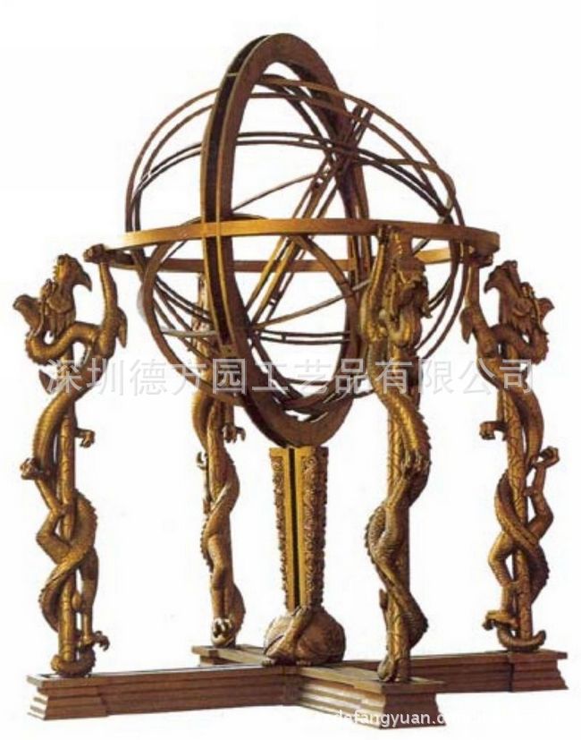 此为我公司生产的仿铜效果浑天仪,高度2米,长宽为1.6米,重量约100KG。浑仪模仿肉眼所见的天球形状,把仪器制成多个同心圆环,整体看犹如一个圆球,然后通过可绕中心旋转的窥管观测天体。浑仪的历史悠久,有人认为西汉落下闳、鲜于妄人、耿寿昌都造过圆仪,东汉贾逵、傅安等在圆仪上加黄道环,改称“黄道铜仪”。早期结构如何已没有记载。而最早有详细结构记载的是东晋史官丞南阳孔挺在光初六年,即公元323年所造的两重环铜浑仪,这架仪器由六合仪和四游仪组 成。到了唐贞观七年,即公元633年,李淳风增加了三圾仪,把两重环改为三重仪,成为一架比较完备的浑仪,称为“浑天黄道仪”。唐朝以后所造的浑仪,基本上与李淳风的浑仪相似,只是圆环或零部件有所增减而已。随着浑仪环数的增加,观测时遮蔽的天区愈来愈多,因此,从北宋开始简化浑仪,到了元朝郭守敬则对浑仪进行彻底改革,创制出简仪。