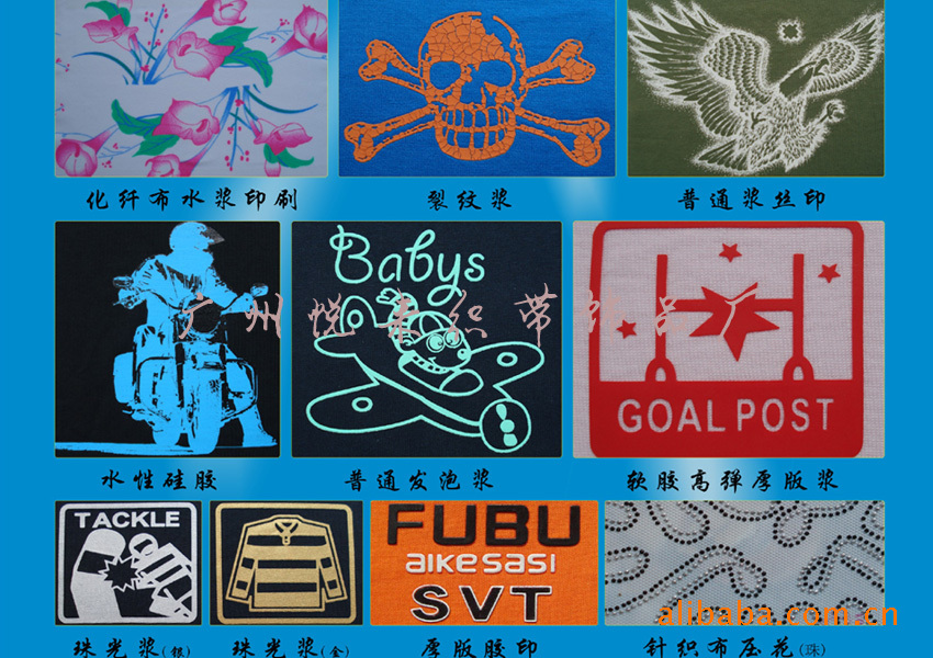 服装印刷效果:胶浆、水浆、厚板浆.