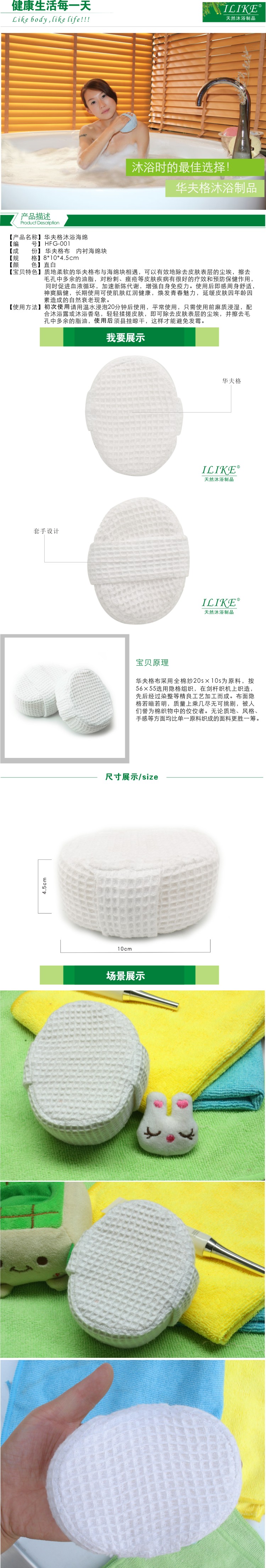 使用前先用温水润湿,添加稍许沐浴露或打些香皂,然后轻轻揉擦全身皮肤,约10—15分钟。使用后用清水洗干净,挂起,凉干,可延长使用期限。