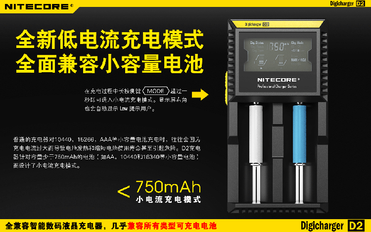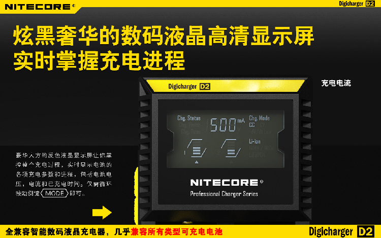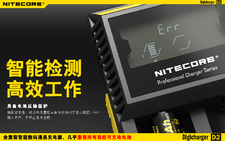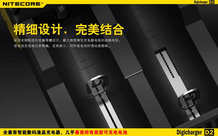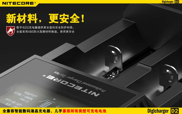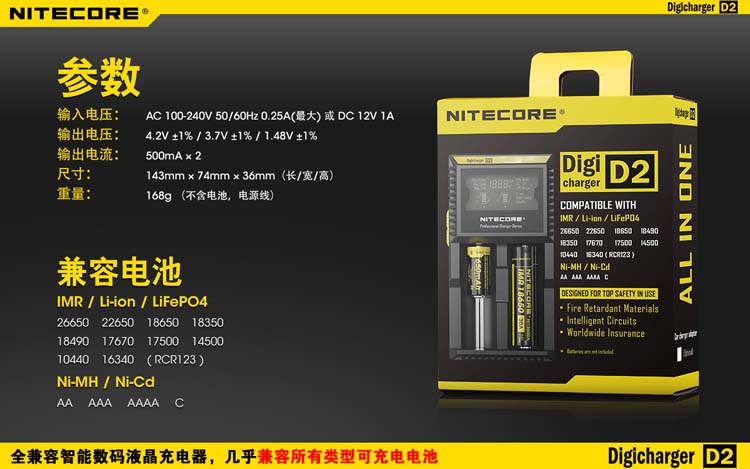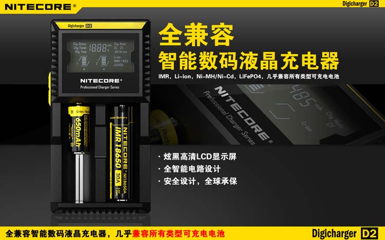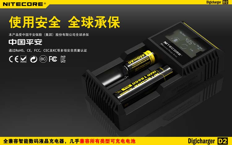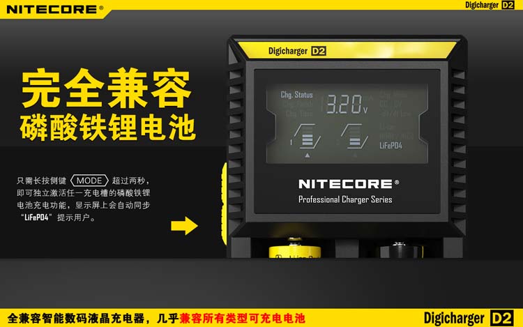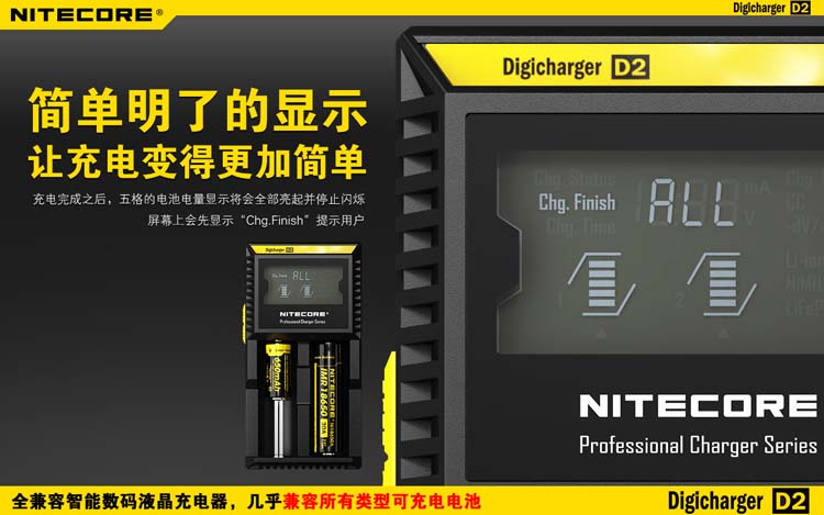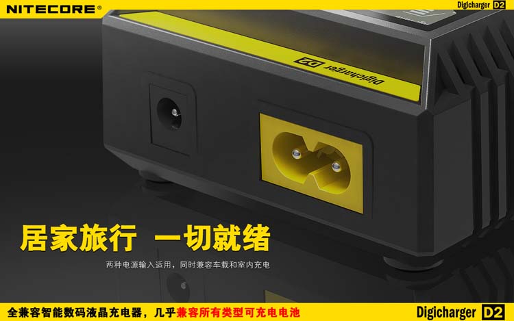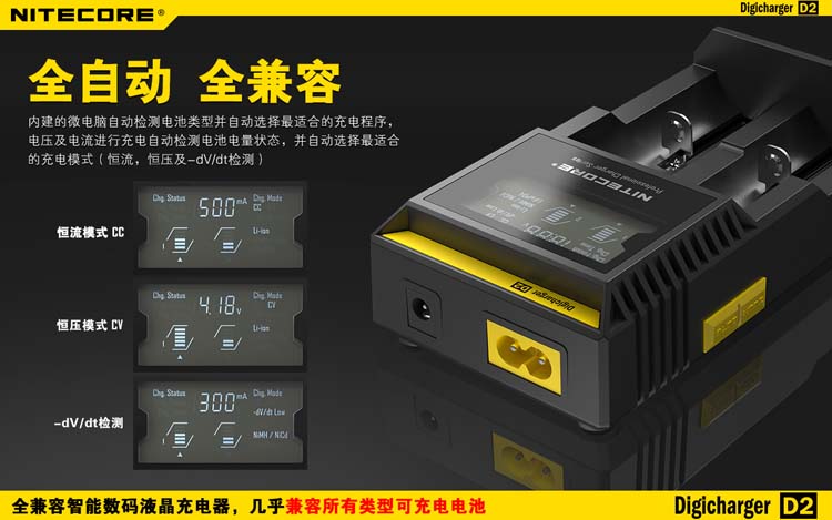 这是一个全能的充电器,它兼容市面上几乎所有型号的充电电池,让您不需要为各种各样的充电电池寻找合适的充电器而苦恼。D2充电器可自动识别锂充电电池及镍氢(Ni-MH)镍镉(Ni-Cd)电池和手动选择磷酸铁锂电池,并自动选择最佳充电模式(恒流,恒压,dV/dt)对其充电。每个D2充电器具有两个由微电脑独立控制的充电槽,用户可在每个槽里放入任意型号的电池进行充电。内建数码液晶显示屏,实时显示电池的各项充电参数和充电进程,在电池充满后充电器将自动停止充电。可以说D2是一个独特全自动的数码液晶智能充电器,您只需要放入电池,其他的事情,放心交给它完成吧!