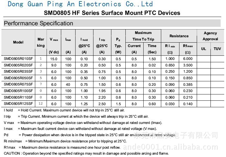 0805 Series工作电流:0.10A-0.5A保护电流: 0.30A-1.00A功率:0.5W