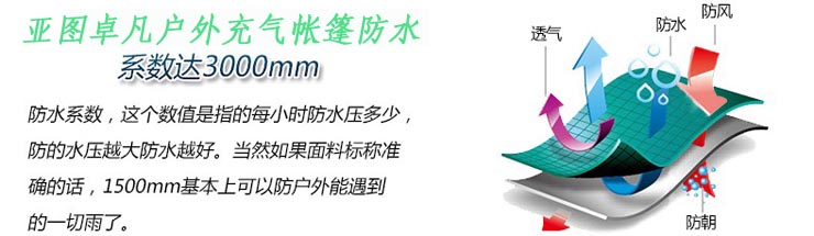 组装简单、撑起速度快、刚性稳定持续时间长,防水性好、使用舒适、维修方便、使用寿命长、特种环境适应性好。产品采用胶粘剂粘合与高频热合相结合的工艺生产,气柱采用PVC双面涂层布,篷布采用防水、抗紫外线材料,具有成型快、强度高,防燃、防霉、抗紫外线、防潮 等优点 。帐篷为充气帐篷,帐篷框架为气柱结构,较之一般金属支架帐篷,具有体轻、折叠后体积小、方便易携带等特点。