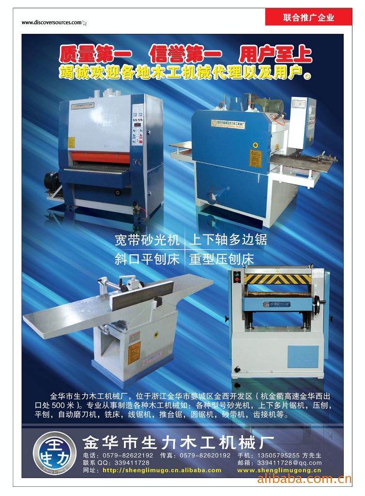 浙江金华市婺城区生力木工机械厂,位于浙江金华市婺城区金西开发区(杭金衢高速金华西出口处500米)。专业从事制造各种木工机械如:各种型号砂光机,上下多片锯机,圆木多边锯,压刨,平刨,自动磨刀机,铣床,线锯机,推台锯,圆锯机,砂带机,齿接机等。质量第一,信誉第一,用户至上,竭诚欢迎各地木工机械代理上及用户。公司网址:/ / 。联系邮箱:339411728@。联系QQ339411728联系电话:0579-82622192传真:0579-82620192 手机:13505795255(方先生)