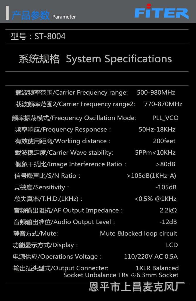 型号:ST-8004 UHF,PLL 一拖四4*32通道无线会议麦克风 主要特性: *使用UHF500-980MHz频段,应用PLL频率合成锁相环技术,频率可调,可同时使用多套,不受干扰。 *集成中央处理器CPU的总控制,配合数字液晶界面显示,操作方便,性能出众。 *采用多级窄带高频及中频选频滤波,充分消除干扰信号。 *采用音频压缩扩展技术,噪音大大减少,动态范围加大。 *设有回输啸叫抑制减弱功能,能有效减少回输啸叫。 *接收机采用多级高频放大,具有极高的灵敏度。 *多重噪音监测电路,特设单音锁定TONE-LOCKED系统,使之具有无与伦比的抗干扰特性。 *选用极佳晶片及优质零部件,使本机音质极为出色。 *空阔最大使用距离100米以上,理想空间使用距离50米。 1、综合性能 载波频率:500-980MHz,采用微电脑CPU控制 PLL锁相环频率合成技术:3组频率可选,每组频率可同时最多使用4套(3*4=12个发射座咪);3组频率即最多可使用3*4=12套(3*4*4=48个发射座咪) 频率稳定性:<±10PPM 动态范围:>105dB T.H.D失真:<0.5% 频率响应:40Hz-18KHz 音频输出:平衡输出:0-600mV不平衡输出:0-300mV TONE单音频率:32K-51.2KHz 会议麦克风发射机 工作频率:500-980MHz(可调) 发射功率输出:高功率档10dBm/低功率档5dBm 拾音头增益调整旋钮:-20dB至+35dB 调制方式:FM调频 最大调制度:±45KHz 高次谐波:低于主波基准60dB以上 使用电池:2节AA电池-可连续使用约8小时 接 收 机 工作频率:500-980MHz(可调) 直流输入电压:DC13.8V 1000mA S/N信噪比:>105dB T.H.D失真:<0.5% 频率响应:40Hz-18KHz 杂讯锁定静噪控制+音码导航锁定静噪控制 |