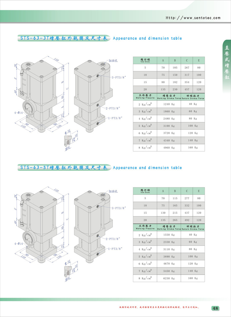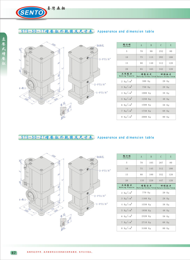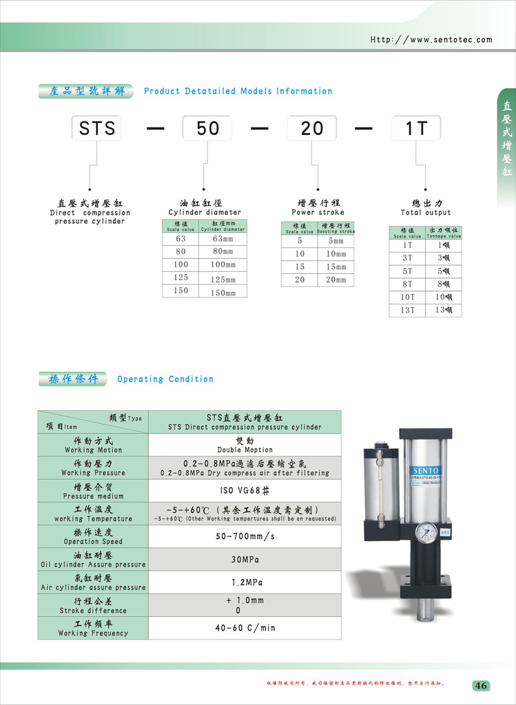 STS直压式增压缸:类似气缸,无预压行程,产品开始动作便是高压行程。特点为:外观小巧,精美,动作速度快捷。