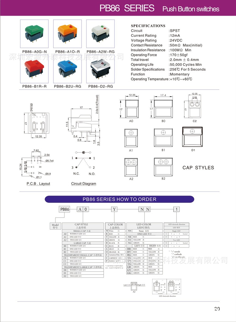 深圳精密按钮 厂家直供 蓝色按键 双灯 六脚 按键开关 50,0000次使用寿命